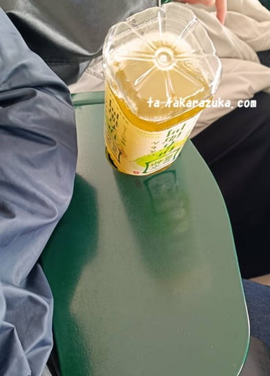 そう、座席についた当時はワクワクしていたんです。危険な階段ですが現時点の私には問題ないし、折りたたみテーブルの穴にペットボトルが入らないと私が言ったら「こうしたらええねん」と